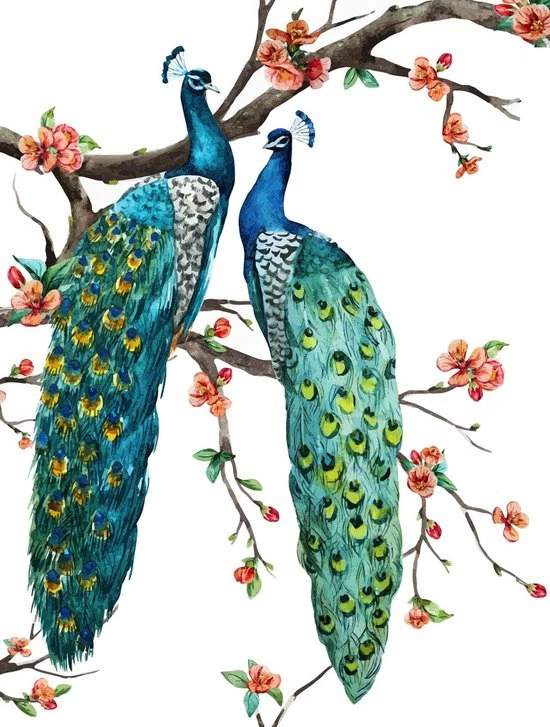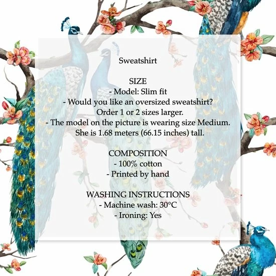 Deze roze sweater heeft een romantische print van pauwen en bloemen.
