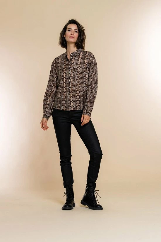 Luchtige blouse van Geisha met een aztec print. De lange mouwen hebben manchetten met een knoop. Dit model heeft een puntkraag en sluit met een rij parelmoer knopen.