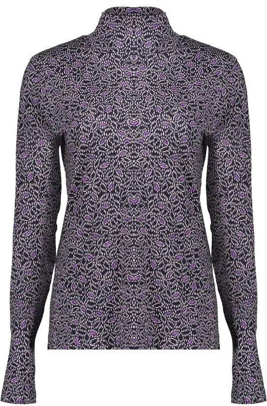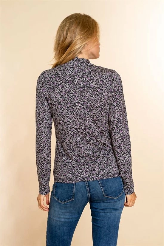 Geisha blouse met een grafische print. Dit artikel sluit aan bij de buste en valt recht naar beneden. De blouse is voorzien van een high neck en heeft lange mouwen.