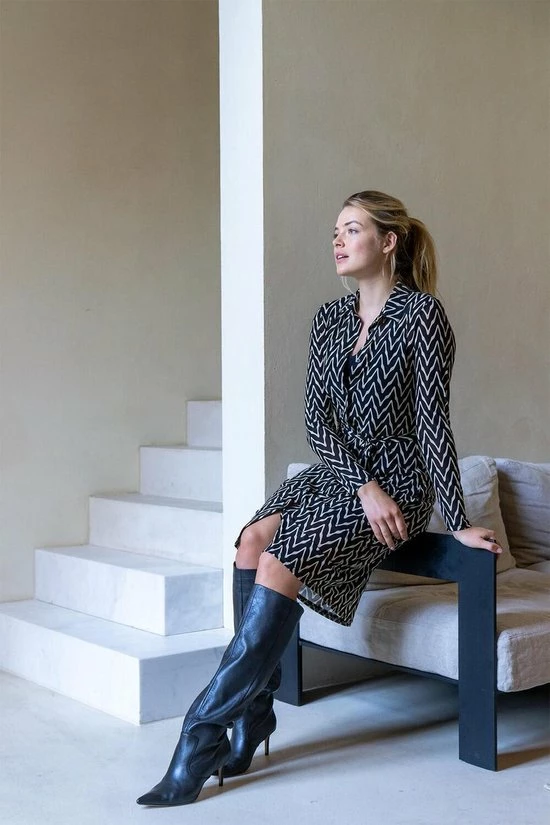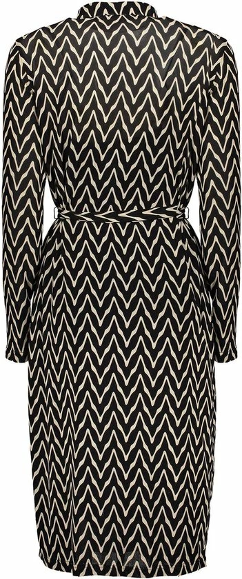 Mesh doorknoopjurk van Geisha. Deze midi jurk is uniek door haar stof en het zigzag patroon. Het artikel is voorzien van een onderjurk en een bijpassend ceintuur. De jurk heeft lange mouwen, een puntkraag en een knoopsluiting. De maat S is 110 cm lang.