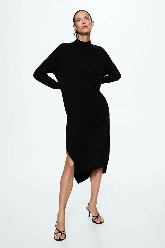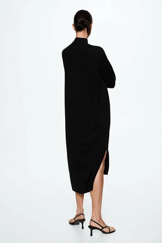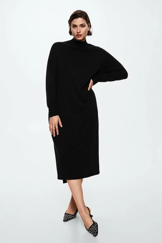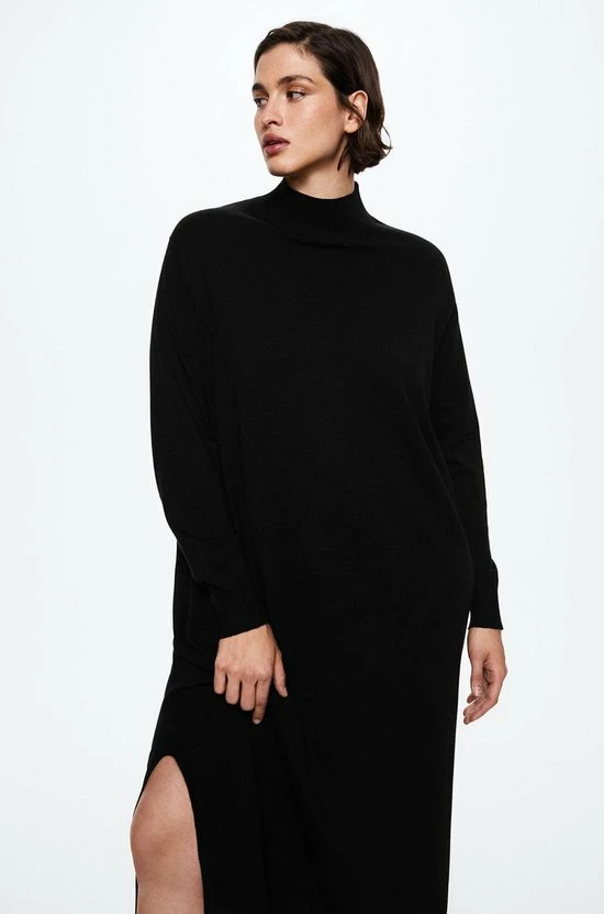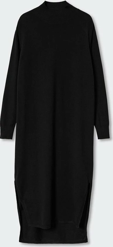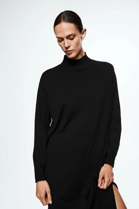 Fijngebreide jurk van Mango met een ruime pasvorm. Dit model heeft een opstaande kraag en lange mouwen. De jurk is afgewerkt met een ribgebreide boord. De totale lengte is 120 cm bij maat S en de jurk heeft een split van 39 cm aan beide zijkanten.