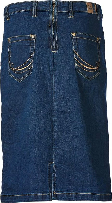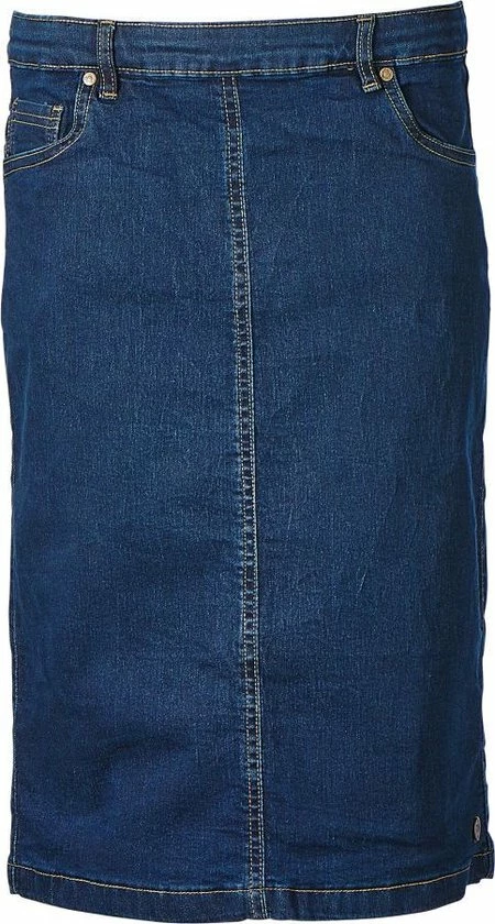 Deze dames denim rok heeft een marine kleur en een ritssluiting aan de achterkant. De rok heeft 1 naad. Verder heeft de rok zakken. Met een lengte van 66cm bij maat 44 is dit de lange variant en valt de rok in de meeste gevallen over de knie.
